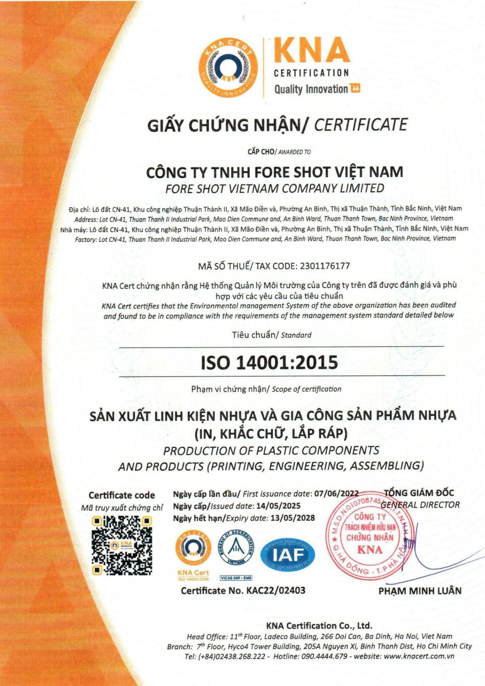 Das Werk in Vietnam hat die ISO 14001 internationale Zertifizierung erhalten, um die Umweltauswirkungen zu reduzieren und sein Engagement für nachhaltige Entwicklung zu verstärken.