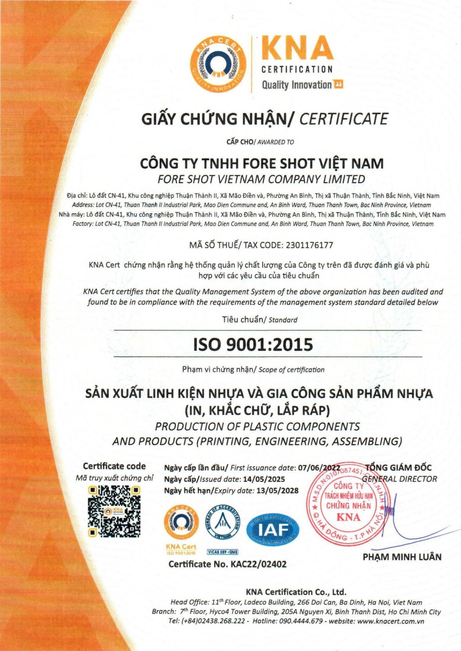 Das Werk in Vietnam hat die ISO 9001-Zertifizierung erhalten, einen international anerkannten Standard für Qualitätsmanagementprinzipien.