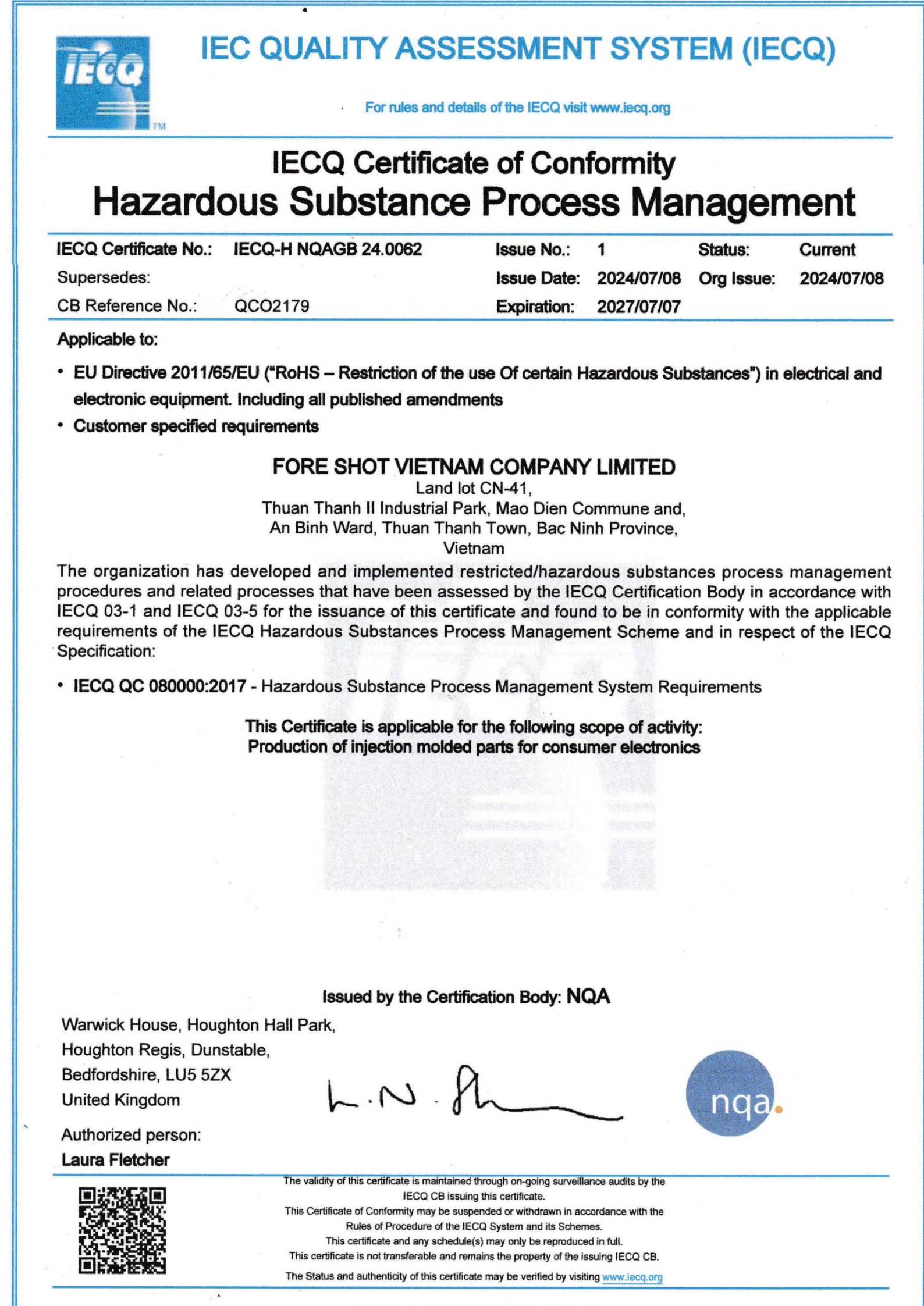 Das Vietnam-Werk hat die QC 080000-Zertifizierung für das Management gefährlicher Substanzen (HSPM) erhalten, um die Einhaltung der Umweltstandards für elektrische und elektronische Komponenten, Produktionsprozesse und Produkte sicherzustellen.